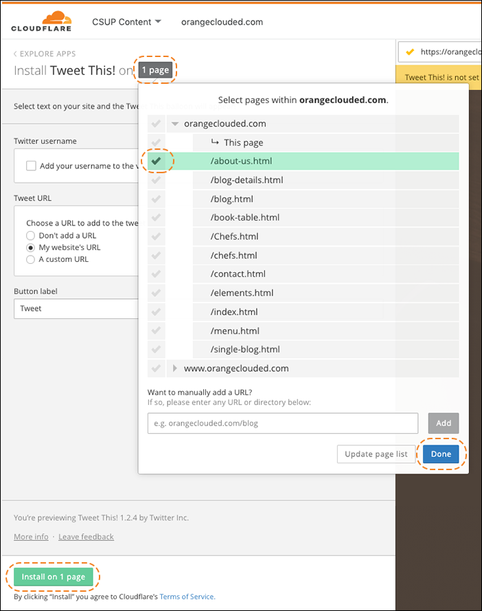 Choose which pages on your site the App will appear by clicking the All Pages button at the top of the page. To apply the App to one (1) page, choose 1 page.