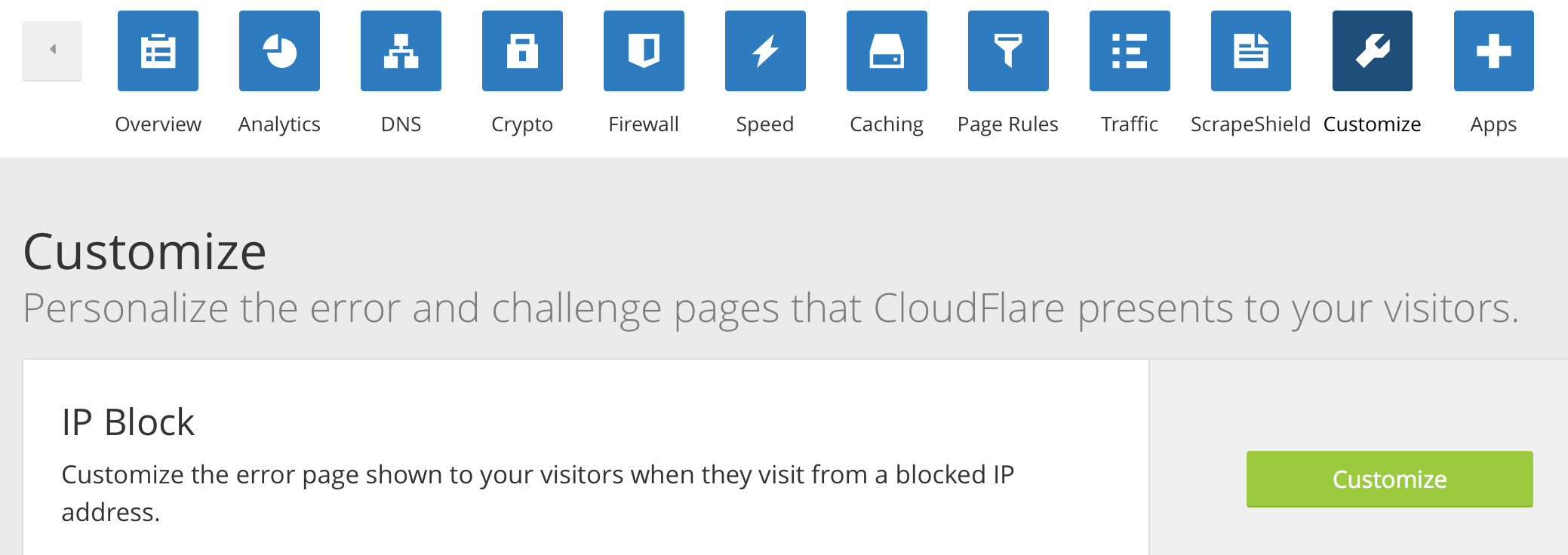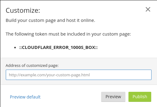 完成自定义错误页面后,您需要将其发布到我们的服务器。这可以通过按下每个可自定义错误旁边的“Customize”按钮来完成。按“Customize”按钮后,将显示一个弹出窗口,要求您提供自定义错误页面的 URL。